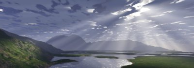 When sunrays filter through clouds, you can sometimes see sunbeams in the air. You can create submeams with Terragen, too. However, many people have found it difficult to figure out how to make the sunbeams visible. What parameter settings are needed? Here is the answer. The key to creating sunbeams is first to make cloud shadows visible. Sunbeams are clouds shadows in the atmosphere. If cloud shadows are not visible, the reason is usually too low Atmosphere Accuracy setting. How high setting is needed, depends on Cloud size and metres point spacing settings. After you have got the sunbeams visible, you can then adjust other settings to make the beams stronger. On Page 2, I'll give step-by-steps instructions on how to create sunbeams. On Page 3, the effect of Atmosphere Accuracy setting vs. cloud size is compared. |